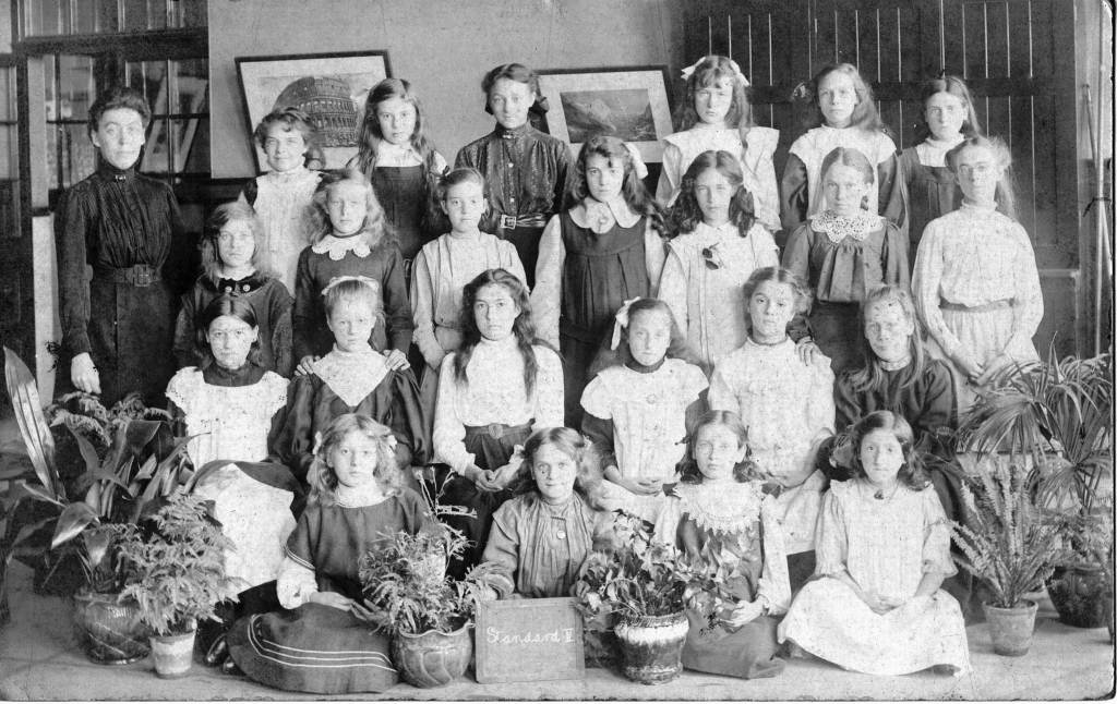 Victoria May Griffiths at school sometime before 1910. The "Standard V" or "fifth class" level was the year after which they either went to high school or left school to work, at around age 12 or 13 years. The school-leaving age was raised to 14 years in 1918 and then 16 years in 1972.