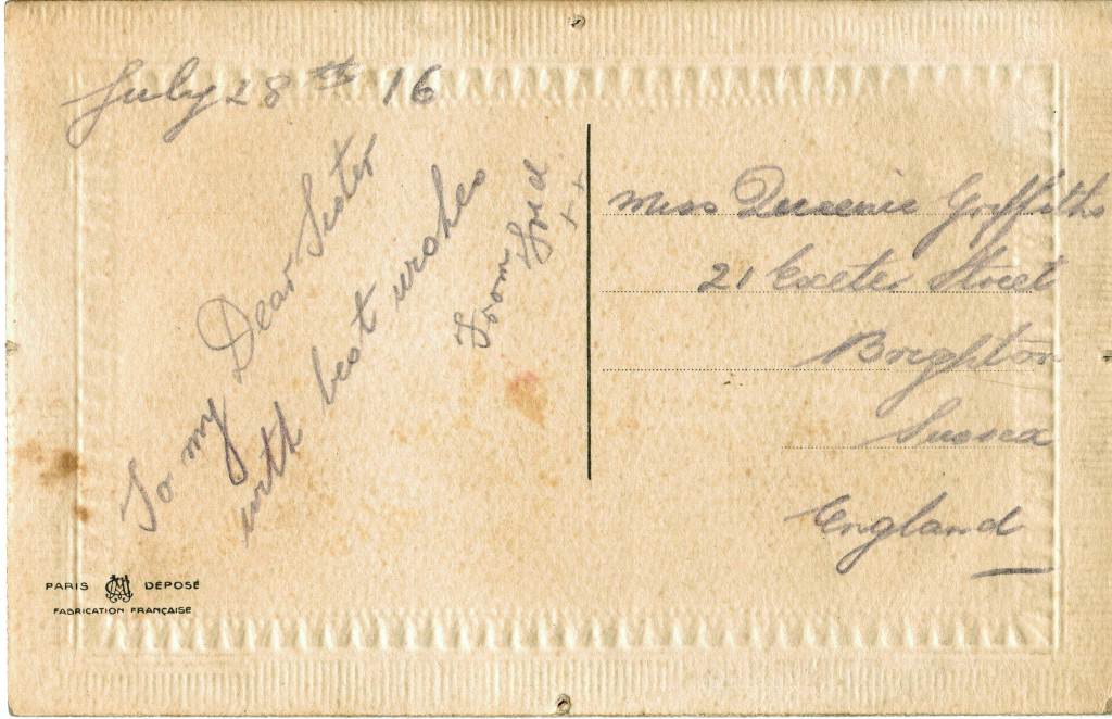 Postcard sent from France to Fred's sister Queenie (Victoria May) 28 July 1916 - back.