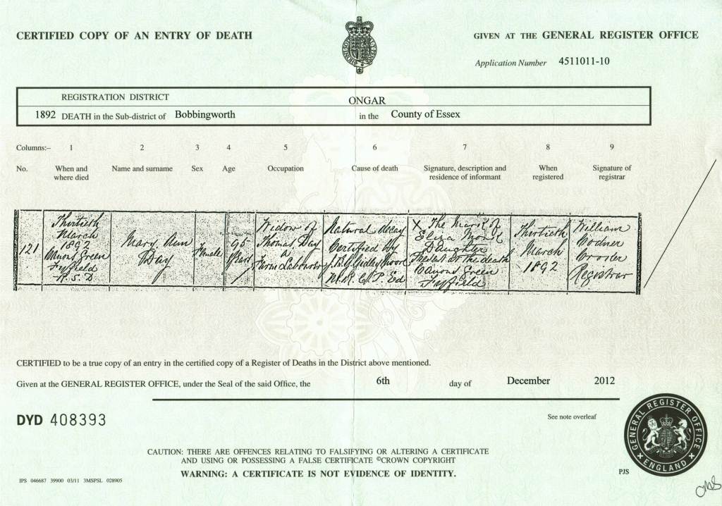 Death Certificate for Mary Ann Day, 13 March 1892 at Canon's Green, Fyfield, Essex.