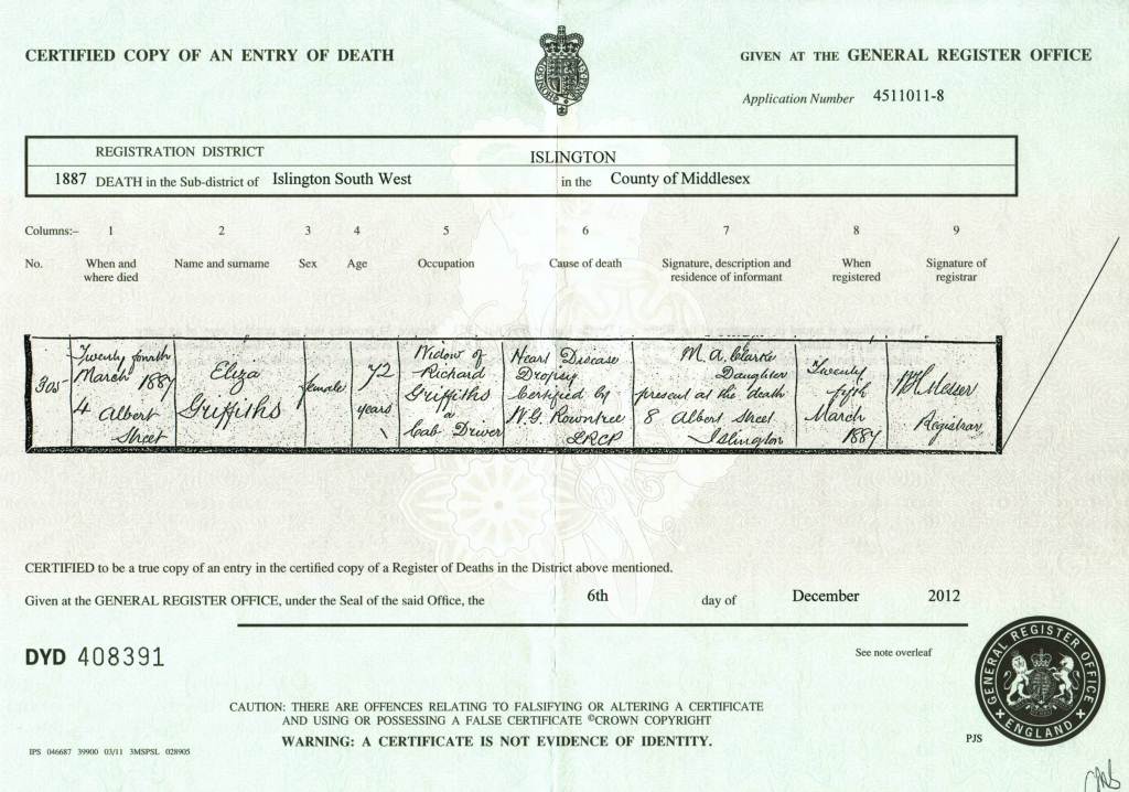 Death Certificate for Eliza Griffiths, 24 March 1887 at Islington, London.