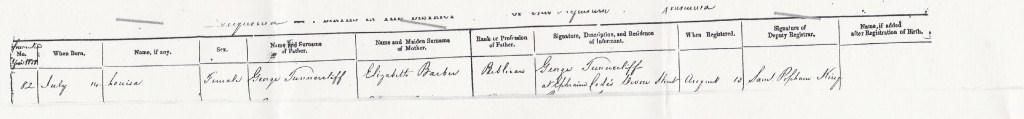Birth entry for Louisa Tunnecliffe, 14 July 1858 at New Plympouth, Taranaki, New Zealand