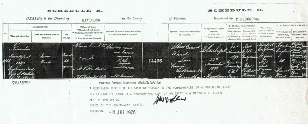 Death certificate for Jane Ward, 21 November 1893 at Hawthorn, Victoria