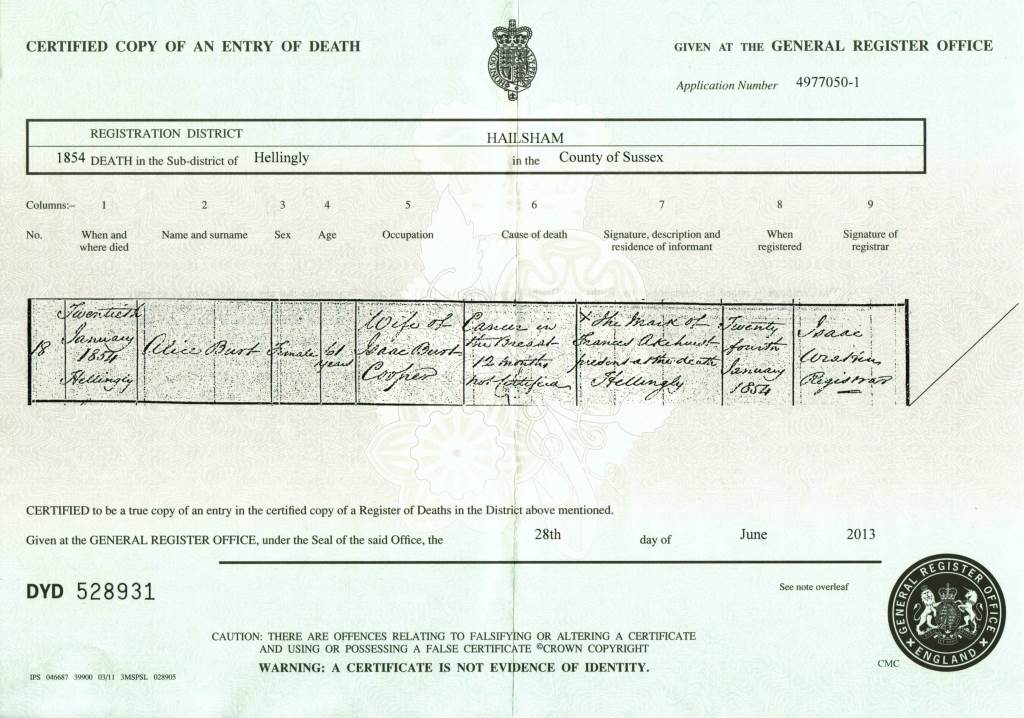 Death Certificate for Alice Burt, died 20th January 1854 at Hellingly, Sussex.