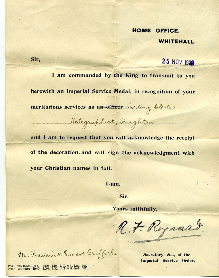 Imperial Service Medal Award to Frederick Ernest Griffths, 25 Nov 1920
