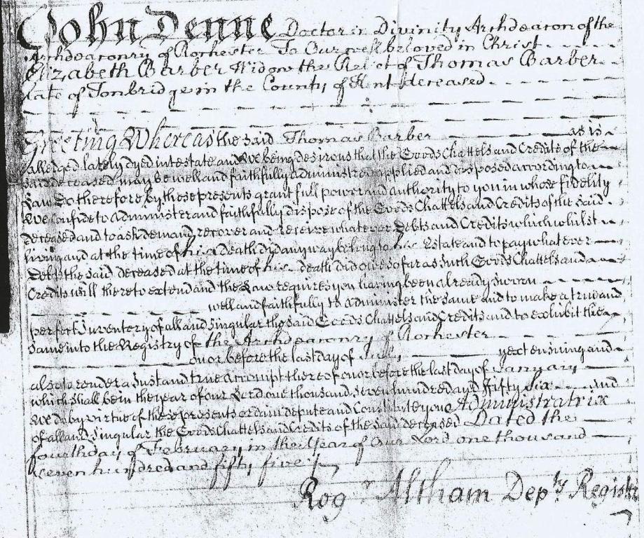 Administration of Thomas Barber deceased of Tonbridge, 4 February 1755