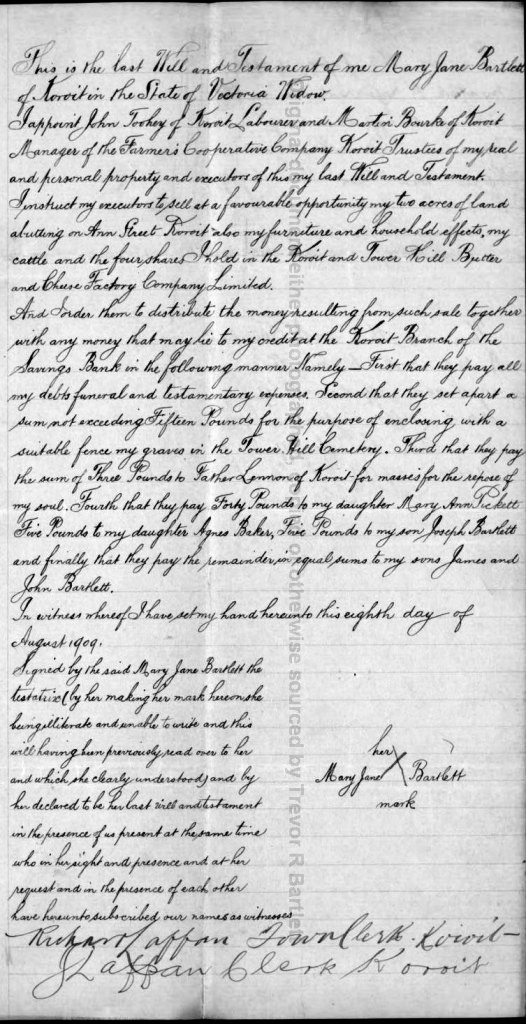 The will of Mary Jane Bartlett, 8 August 1909.