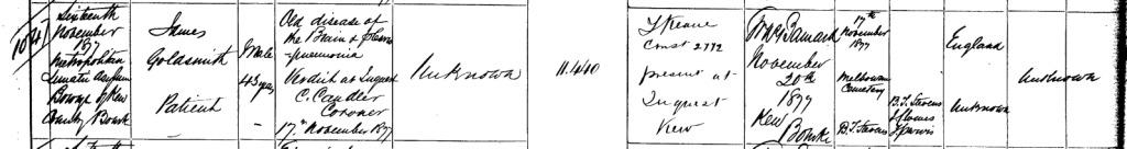 Death certificate for James Goldsmith, 16 Nov 1877