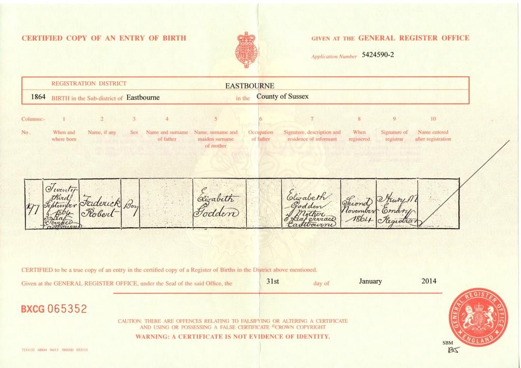 Birth Certificate for Frederick Robert Godden, 23 September 1864