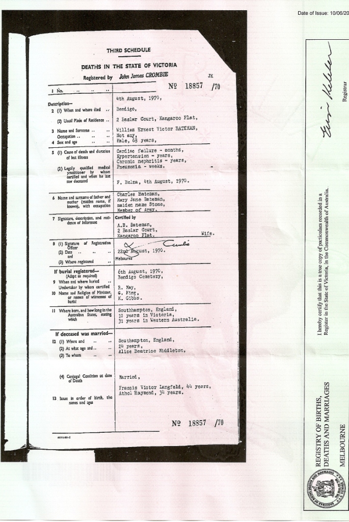 Death Certificate of William Ernest Victor Bateman, died 4 Aug 1970. (Supplied by Debbie Acton, Victoria, Australia)