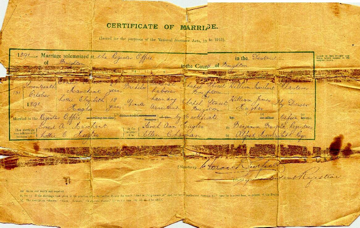 Marriage Certificate of Ernest Albert Marchant and Charlotte Elizabeth Hughes 1891