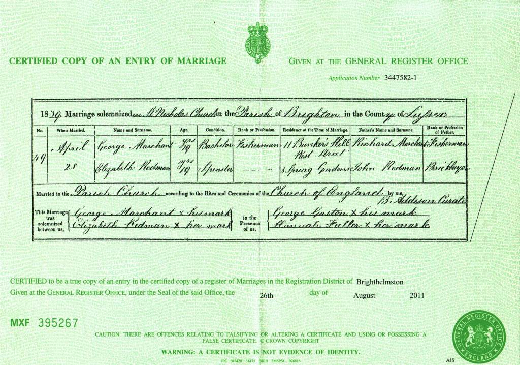 Marriage Certificate of George Marchant and Elizabeth Redman 1839