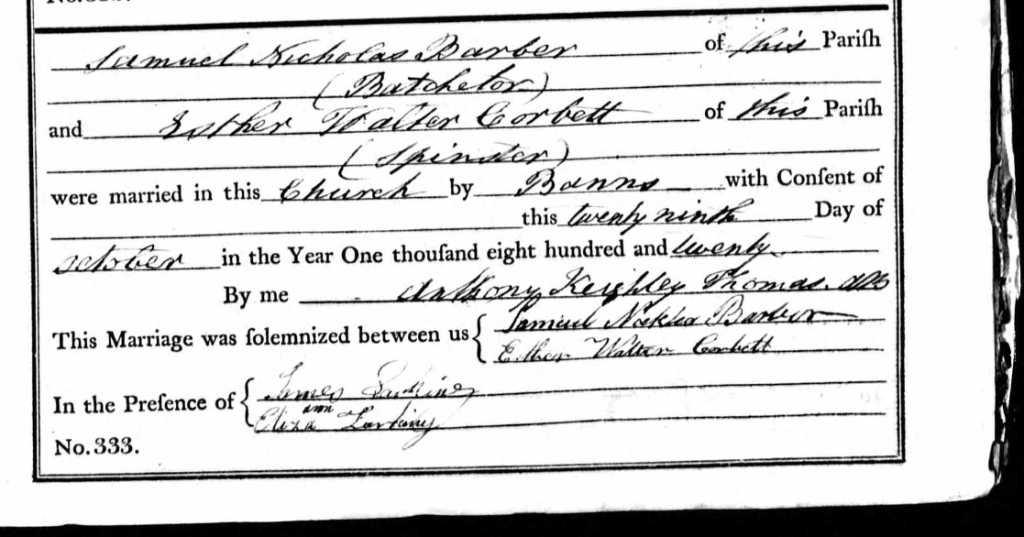 Marriage of Samuel Nicholas Barber and Esther Walter Corbett on 29 Oct 1820 at St Nicholas, Plumstead, Kent.