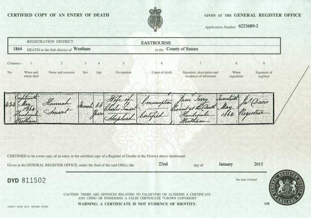 Death Certificate for Hannah Smart, 18 May 1864.