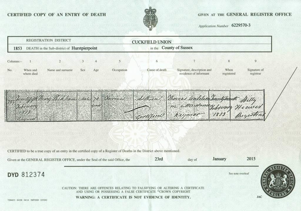 Death certificate for Henry Packham, died 25 February 1853.