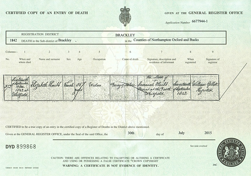 Death certificate for Elizabeth Knibb, 16 September 1842.
