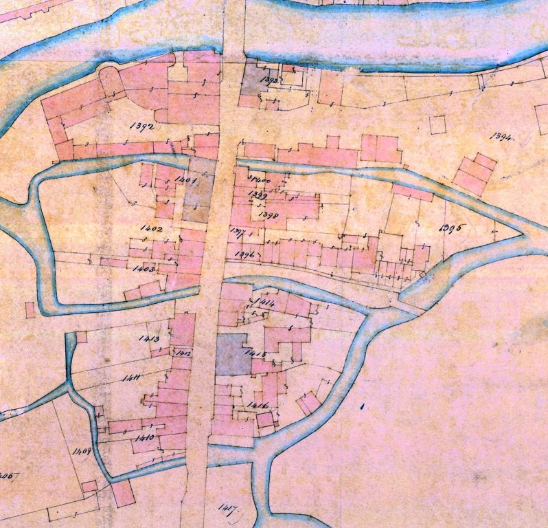 Tithe Map for Tonbridge 1838 showing on plot 1411 the four properties owned by Mary Barber. Note also plot 1415 across the road which is The Bull public house.