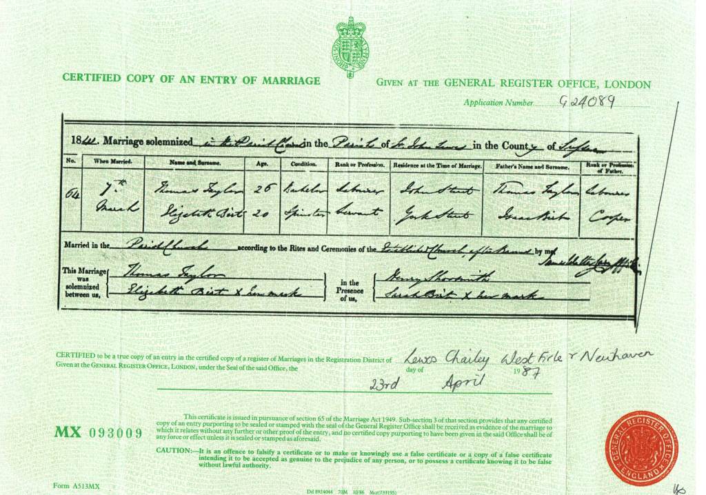 Marriage Certificate of Thomas Taylor and Elizabeth Burt 1841
