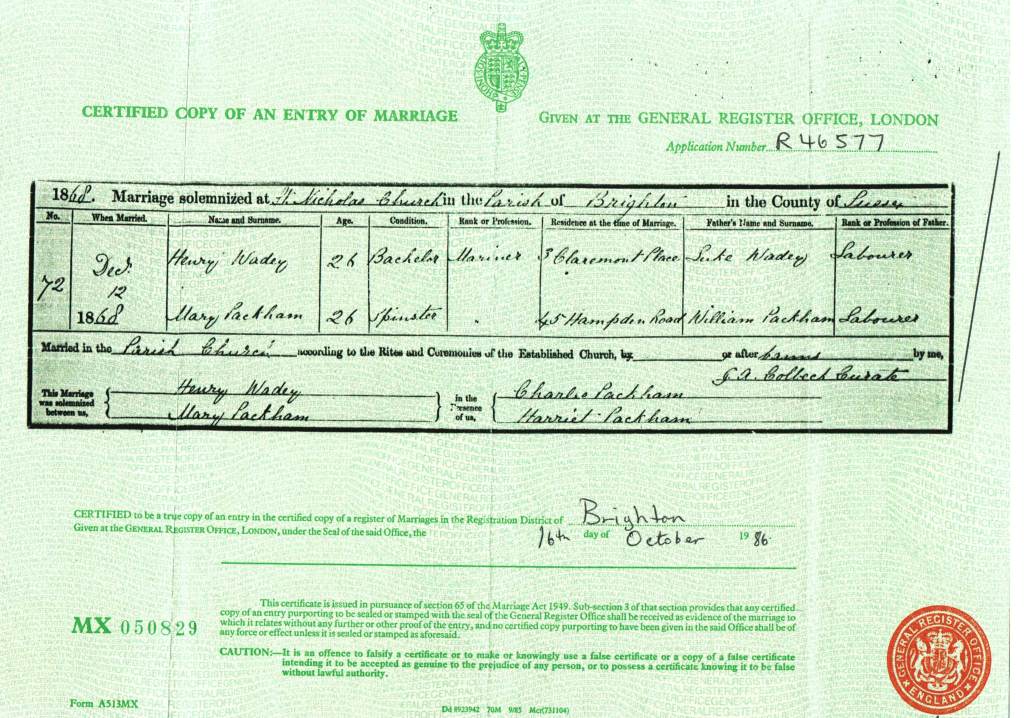 Marriage Certificate Henry Wadey Mary Packham 1868