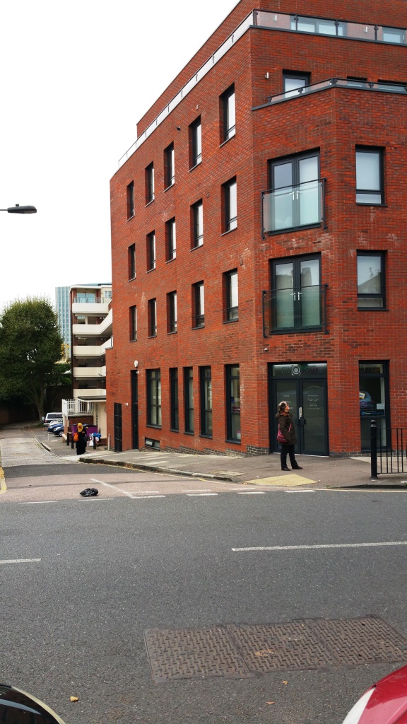 Julitha Barber (nee Brown) at the corner of Harrow Lane and Poplar High Street (November 2015). Looking down Harrow Lane.