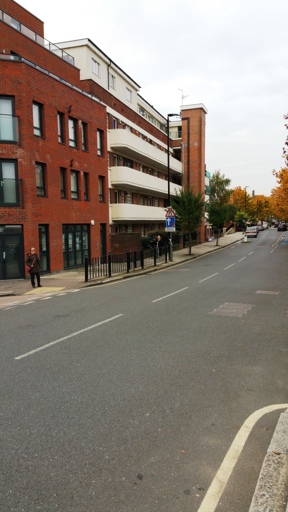 Julitha Barber (nee Brown) at the corner of Harrow Lane and Poplar High Street (November 2015). Looking down Poplar High St.