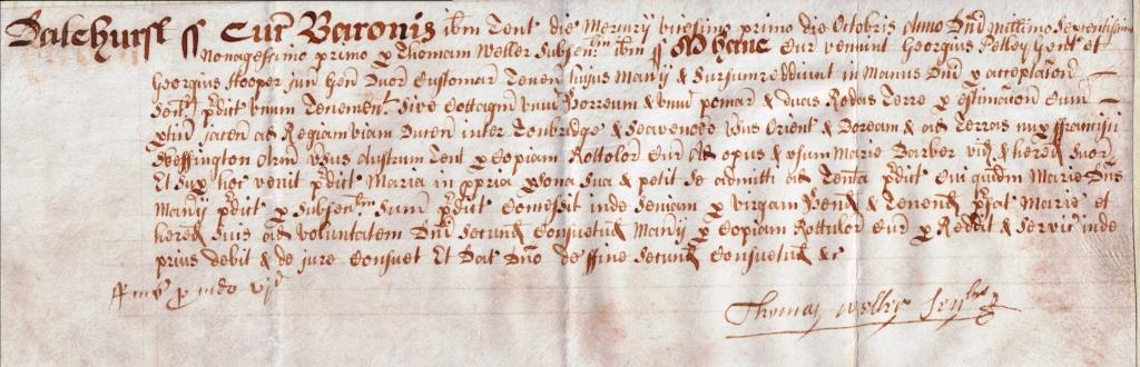 The widow Mary Barber's copy of the manorial court record (in Latin) of her admission to a copyhold property in the manor of Datchurst alias Hilden (now Hildenborough in Kent). It is signed by Thomas Weller, Steward of the manor. The document was part of a collection of records handed to the Tonbridge Library in the 1950s by a local firm of solicitors. (Tonbridge Library)