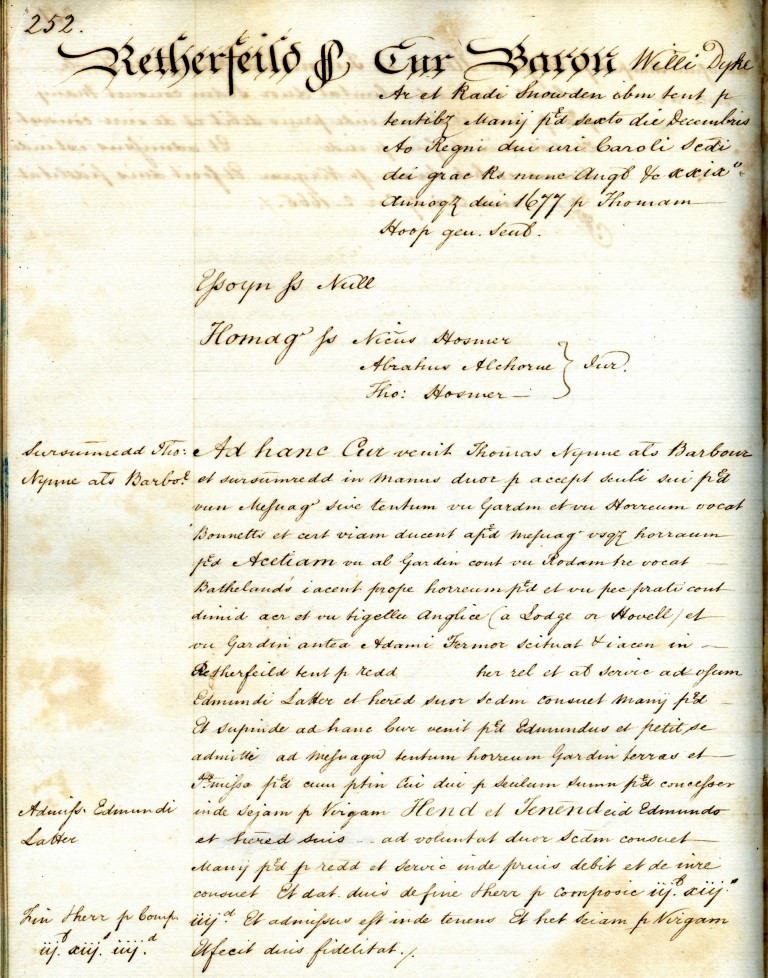 An example of a Court Baron document (in Latin) for the manor of Rotherfield in Sussex, dated 6 December 1677, with the first item recording the transfer of a copyhold property between Thomas Nynne als Barbour and Edmund Latter. (ESRO)