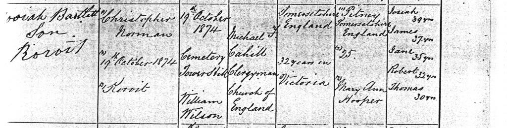Death certificate for Charles Bartlett, 18 Oct 1874 at Koroit, Victoria - part 2.