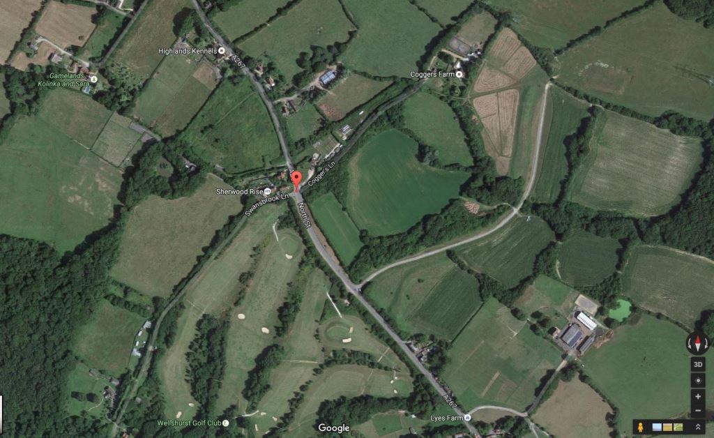 Cogger's Cross at Hellingly, East Sussex as it appears on Google Maps today at coordinates 50.916593, 0.242295. (c) Google 2016