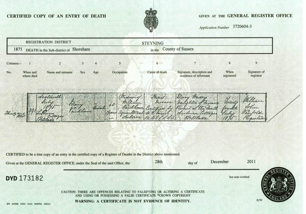 Death Certificate of Mary Packham 1875
