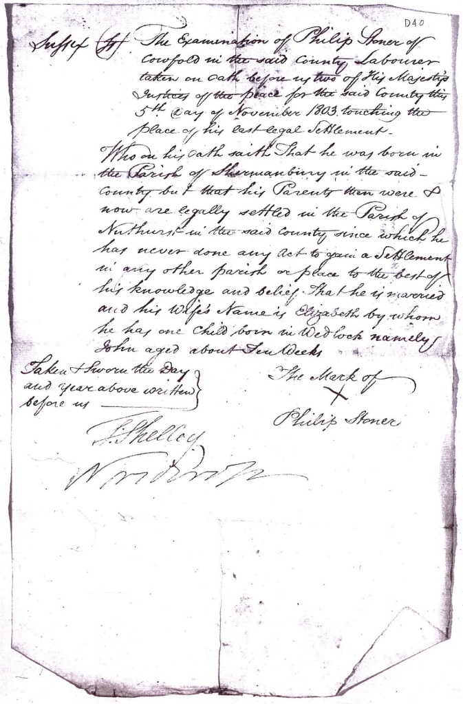 Settlement examination of Philip Stoner, 5 November 1803.