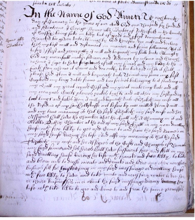 Will of George Nynne alias Barber of Rotherfield, made 18 January 1617 - page 1.