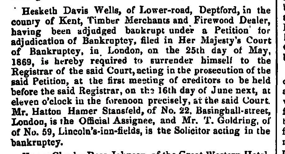 Hesketh Davis Wells Bankruptcy - London Gazette 28 May 1869.