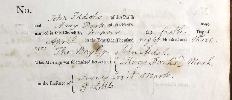 Marriage of John Iddles and Mary Park, 10 April 1803, at Kings Stanley, Gloucestershire.