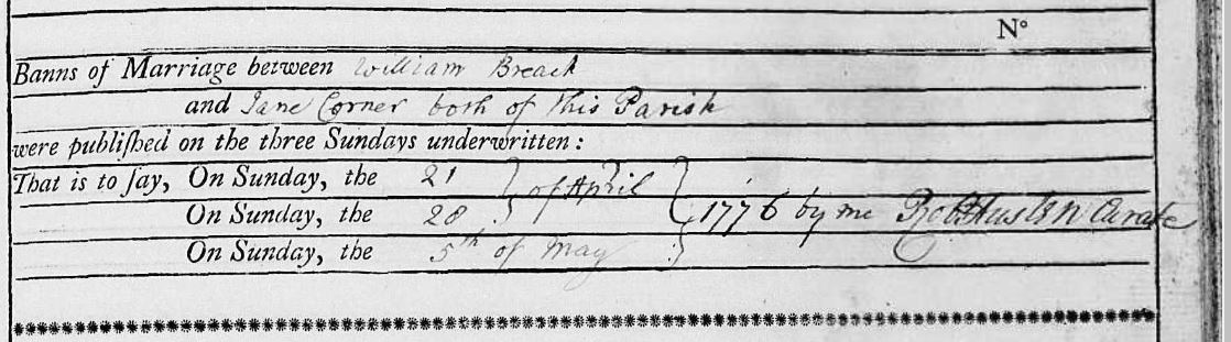Marriage banns at Hamsey for William Breach and Jane Corner, April 1776.