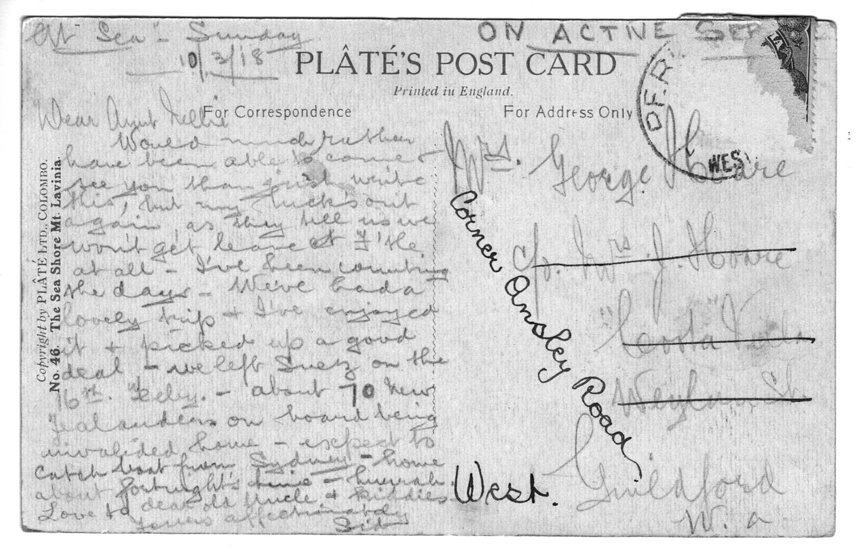 Postcard sent by Sidney Arthur Hoare, 10 March 1918 on return to Australia from WW1 (back).