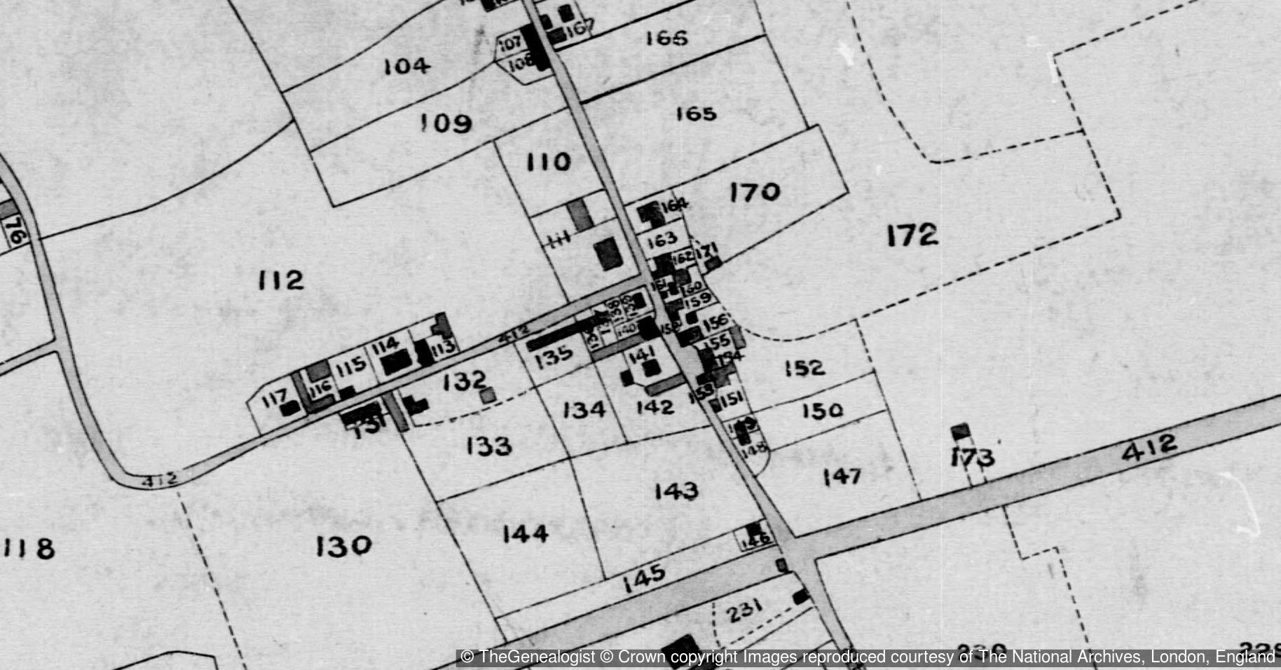 The village of East Ham on the 1838 tithe map. Thomas Collier occupied plots 162 and 163. The house on plot 162 is considered to be Ivy House.