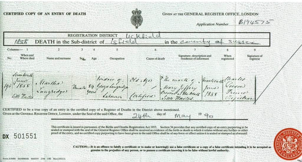 Death Certificate of Martha Langridge 1858