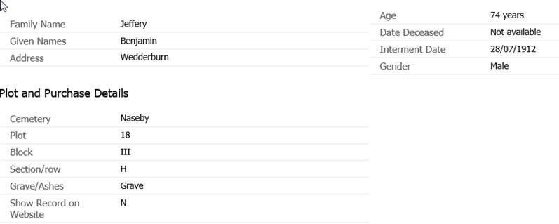 Naseby cemetery - Benjamin Jeffery details.