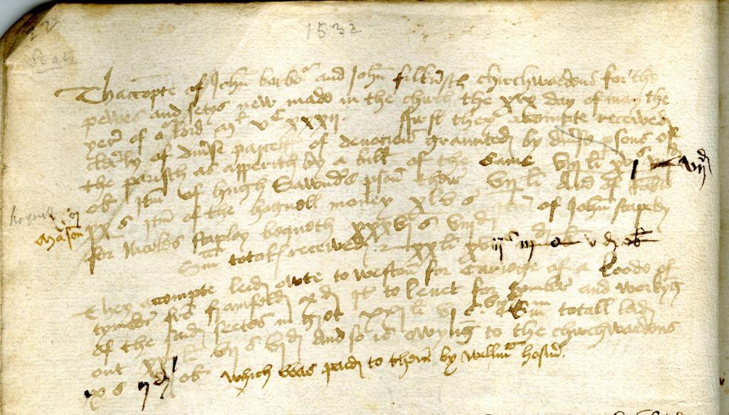 Entry from the churchwardens' account book 19 May 1532 regarding the building of “pewes and setys”.