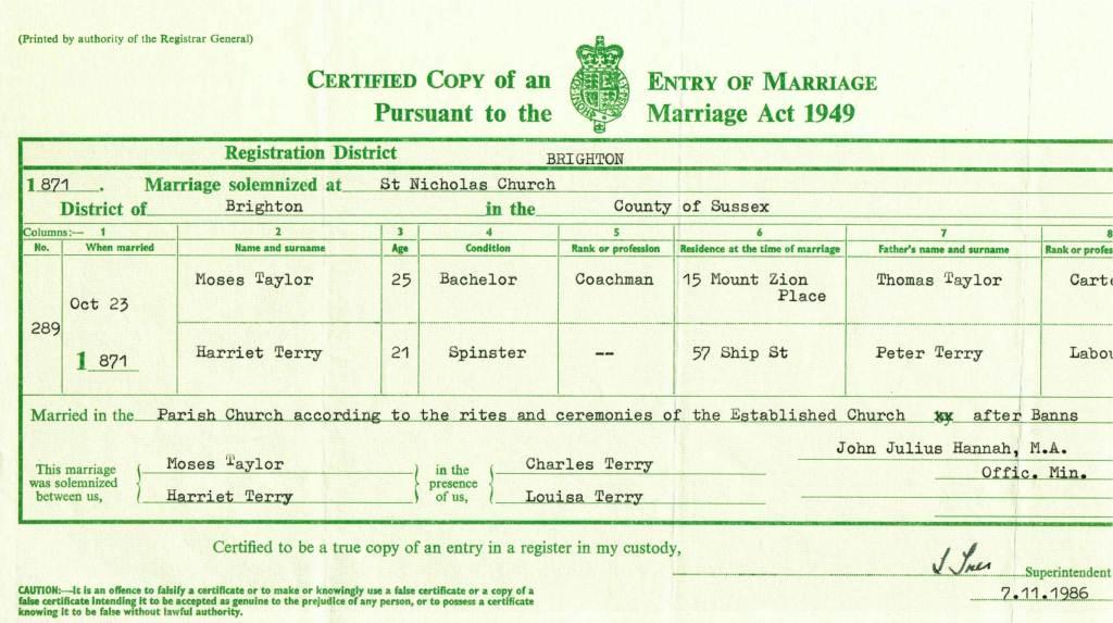 Marriage Certificate of Moses Taylor and Harriet Terry 1871
