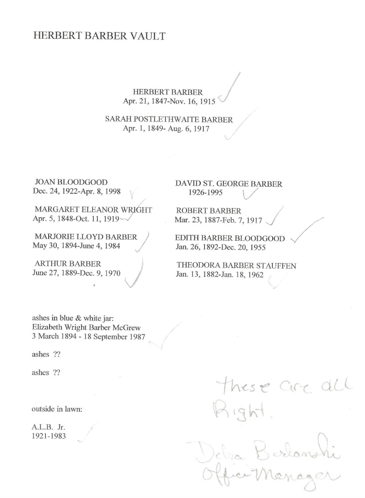 Herbert Wells Barber vault - Document 3. (Courtesy of Wendy Bish-McGrew, 2020)