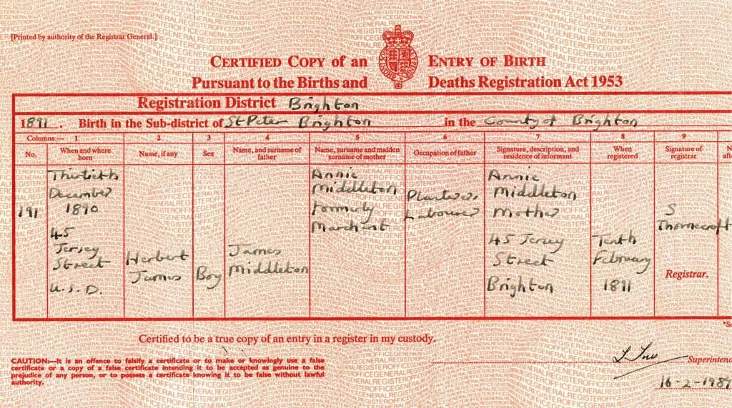 Birth Certificate of Herbert James Middleton 1890