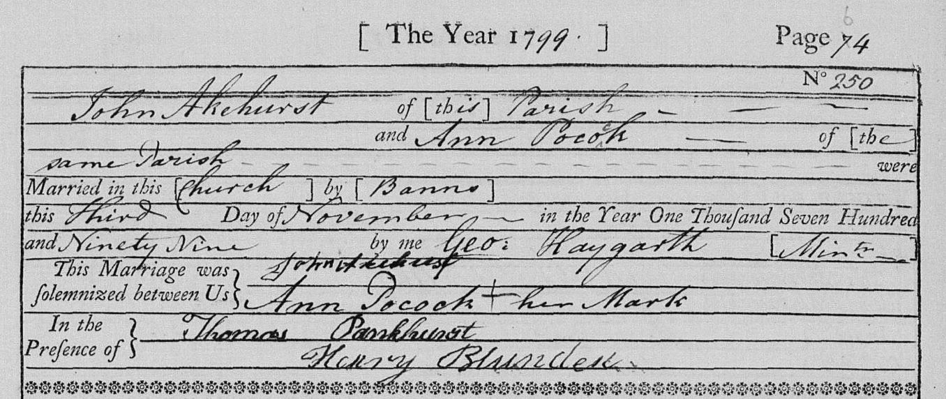 Marriage of John Akehurst and Ann Pocock on 3 Nov 1799 at Hellingly.