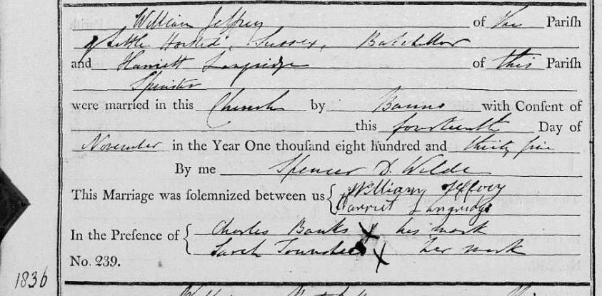 Marriage - William Jeffery and Harriate Langridge, 14 Nov 1835 at Fletching.