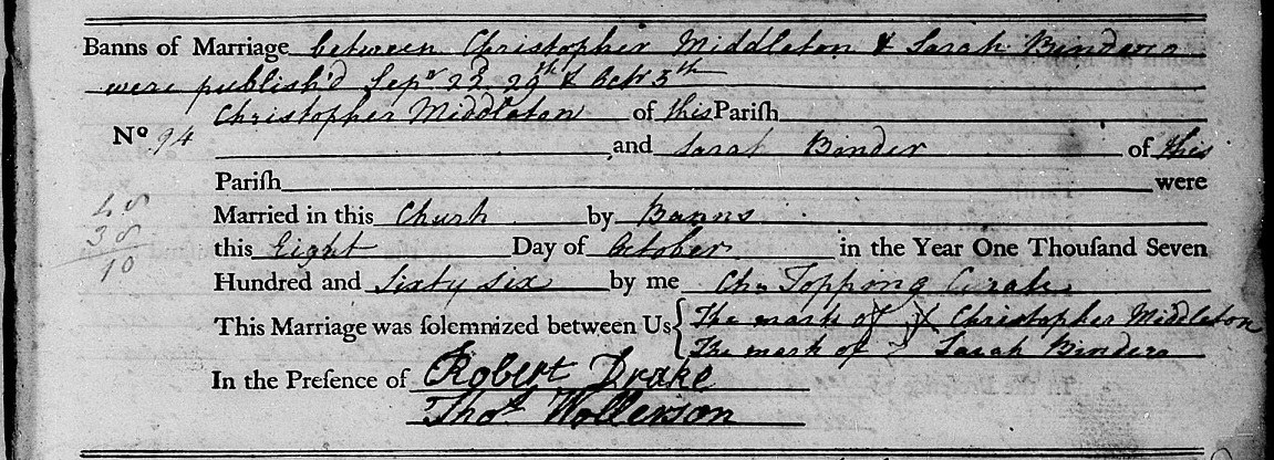 Marriage of Christopher Middleton and Sarah Binder on 8 Oct 1766 at Yaxley, Huntingdonshire.