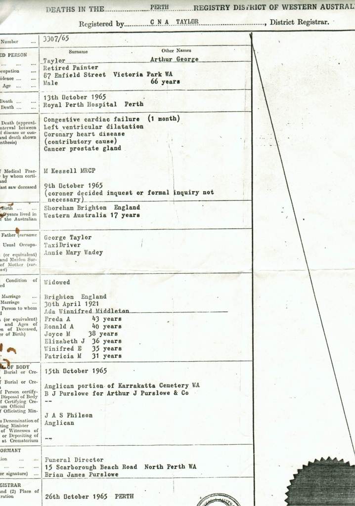 Death Certificate - Arthur George Taylor, 1965