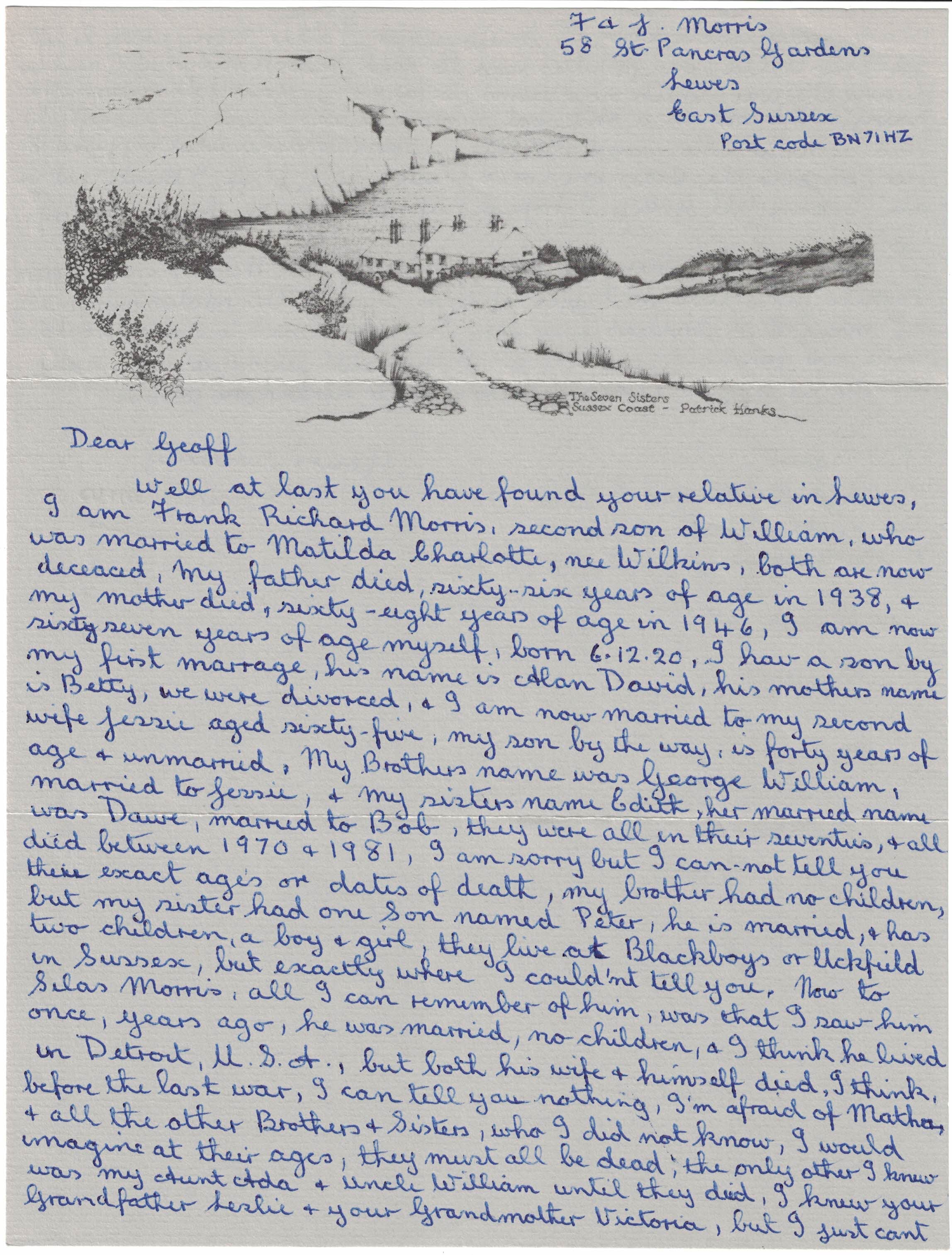 Letter from Frank Richard Morris after Geoffrey Barber made contact in early 1988. (page 1 of 2)