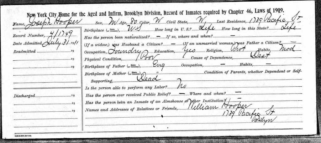 Joseph Hooper NY Census of Inmates in Almshouses and Poorhouses July 31, 1911