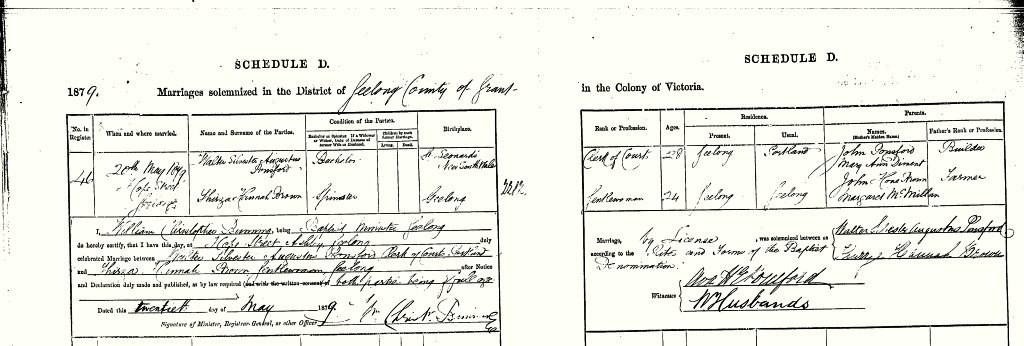 Marriage Certificate for Thirza Hannah Brown and Walter Silvester Augustus Ponsford, 20 May 1879