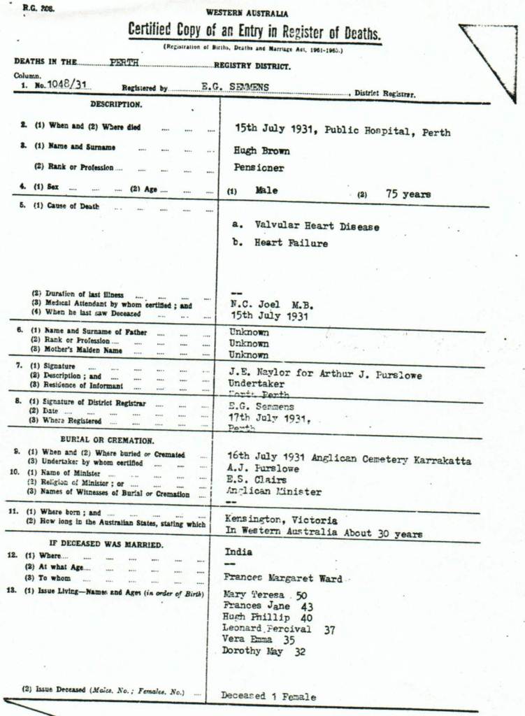 Death Certificate - Hugh Brown, 15 Jul 1931